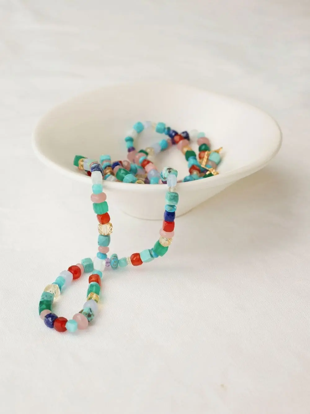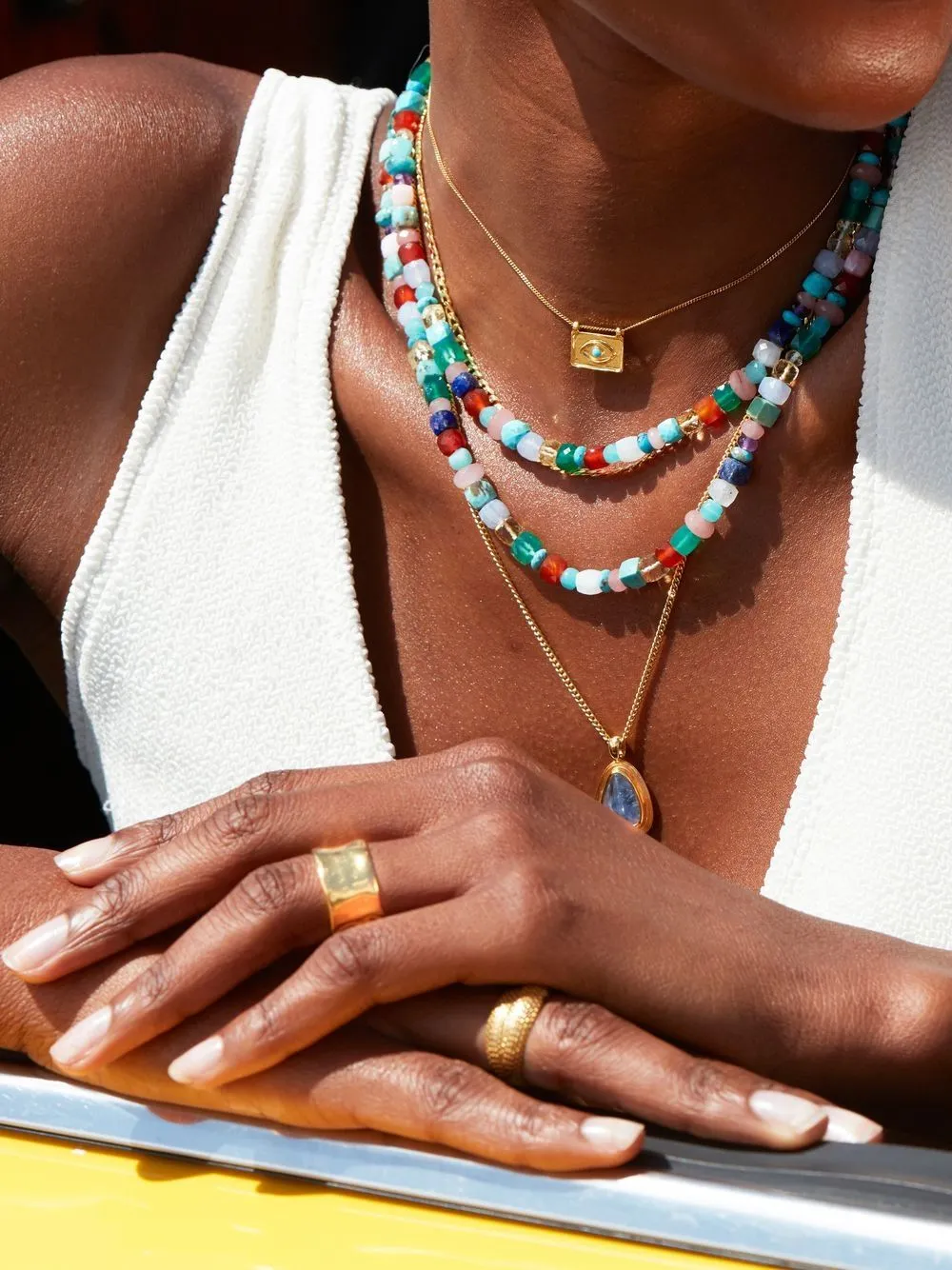 Monica Vinader’s Freedom necklace is made from upcycled fragments of natural gemstones. Scores of multicoloured stones are strung from a gold vermeil-plated chain.