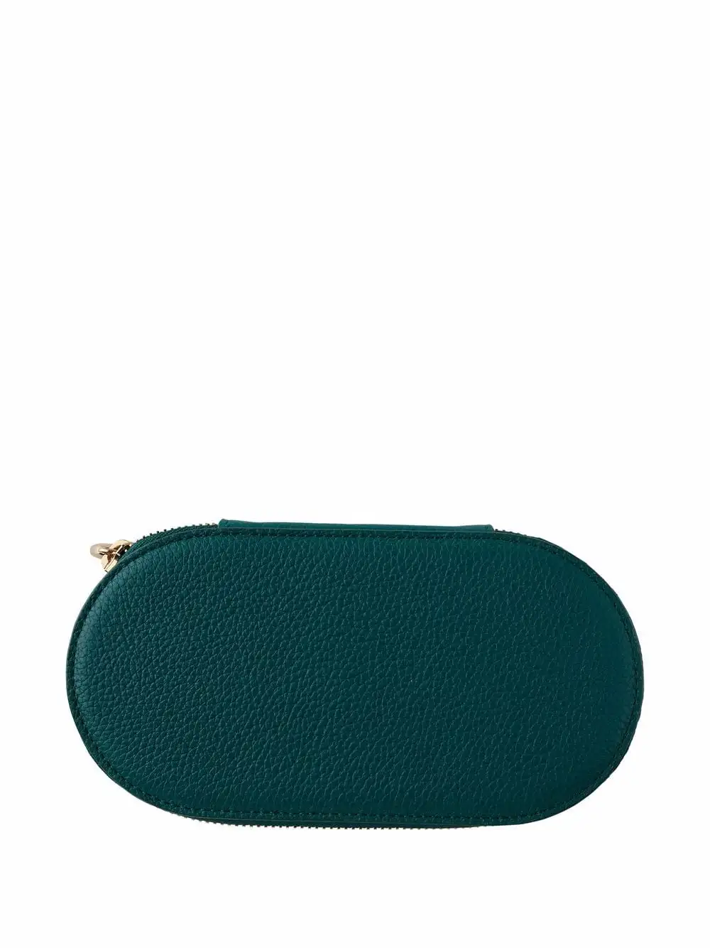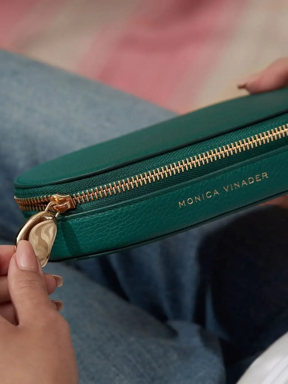 Dark green calf leather oval leather jewellery box from MONICA VINADER featuring embossed logo to the front, all-around zip fastening and partitioned compartment. Every handcrafted Monica Vinader piece comes with a five-year warranty.. Complimentary engraving at any Monica Vinader store, for a layer of personalisation.. Conscious: We’ve partnered with Good On You – an ethical agency that rates how sustainably brands perform. This item comes from a brand that performs well in relation to their impact on the planet..