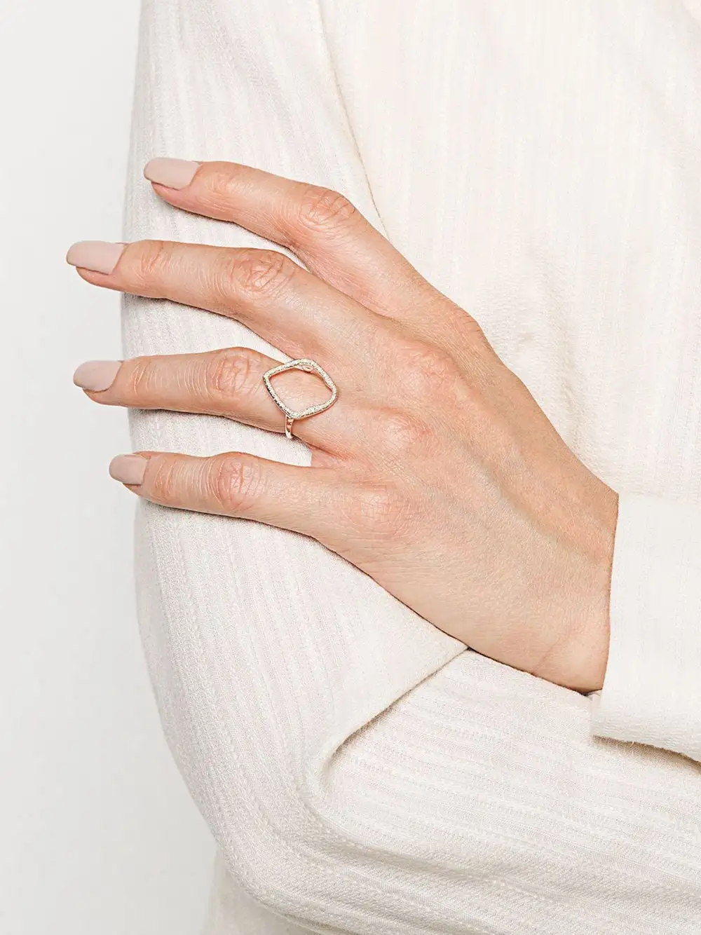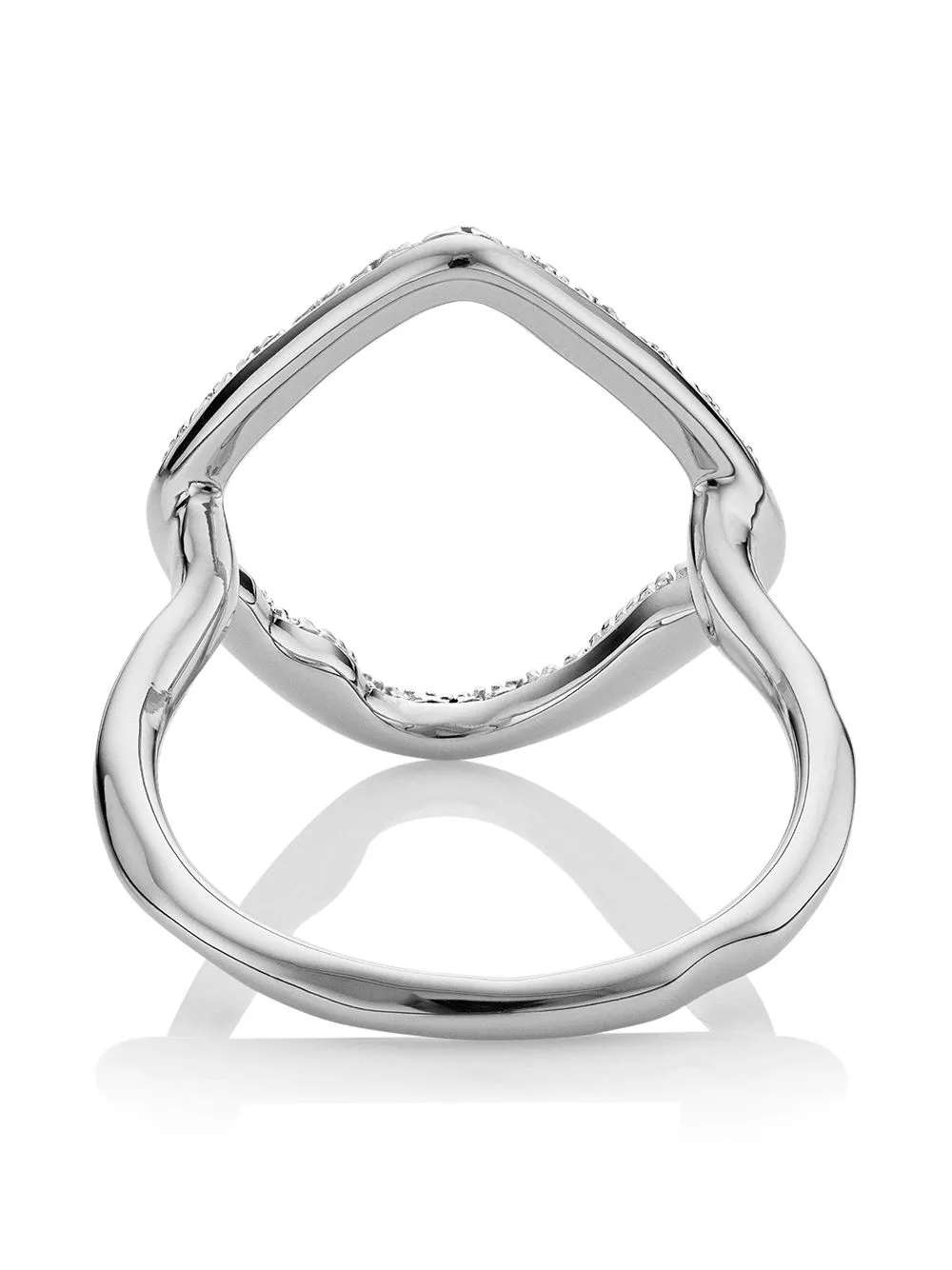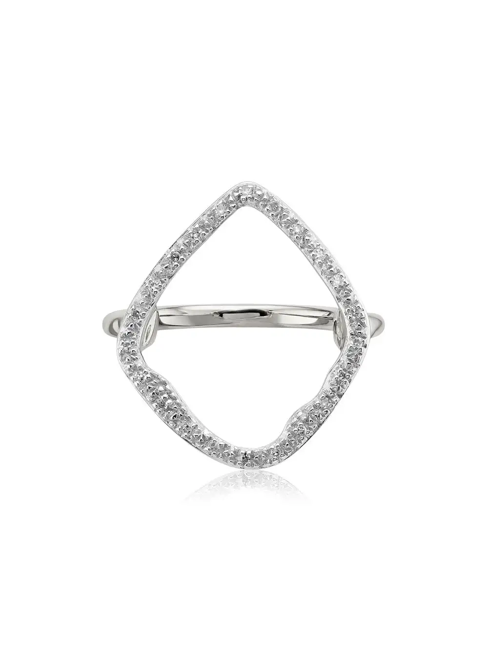 The irregular hoop shape on this ring measures approximately 16.7mm x 19.7mm and features pave set diamonds totalling 0.06 carats. This cocktail ring is a contemporary way to wear diamonds and shines beautifully alone or paired with other jewellery from the Riva collection.Â