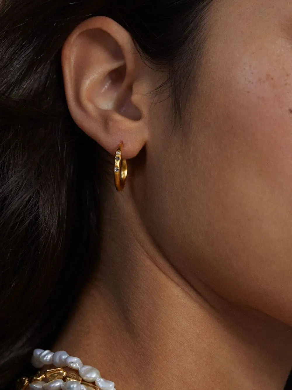 Designed in collaboration with sustainable fashion brand Mother of Pearl, the silhouette of Monica Vinader’s gold vermeil-plated hoop earrings are inspired by nature’s imperfections. They’re inlaid with miniature galaxy diamonds that sparkle like stars in the sky.